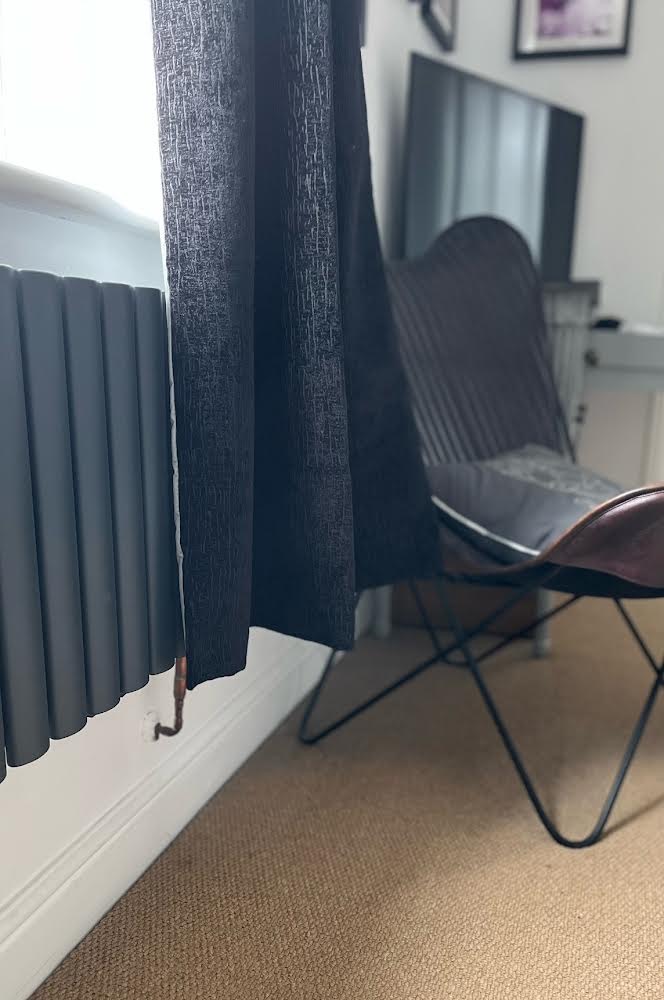 I love natural light in the day and find the white in the walls really helps to bring the brightness in. I love a pitch-black room at night so use blackout blinds behind my heavy lined curtains and just rely on the subtle hue of my clock to guide me on time.